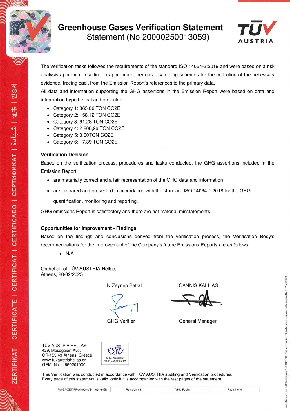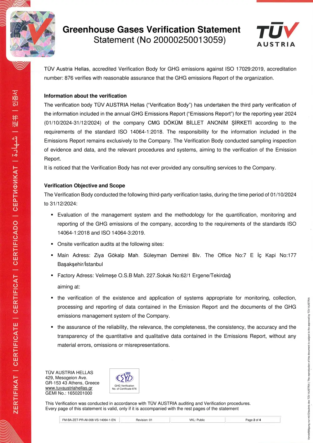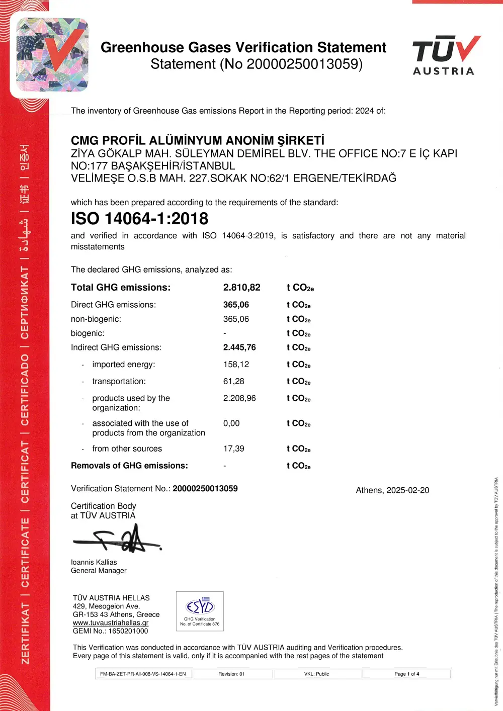 Şirketimiz, sürdürülebilirlik ve çevresel sorumluluk alanındaki taahhütlerini bir adım daha ileriye taşıyarak, ISO 14064-1 belgesini almıştır. Bu belge, şirketimizin karbon ayak izini doğru bir şekilde ölçme, raporlama ve yönetme konusunda uluslararası kabul görmüş standartlara uygun hareket ettiğini gösteren önemli bir belgedir.
